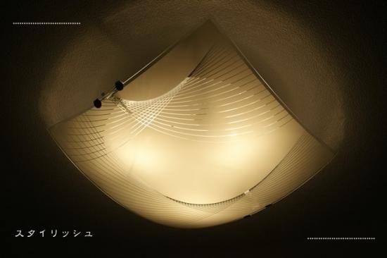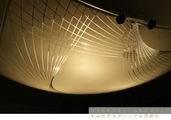艶のある白いガラス素材に、クリアなラインが映えるスタイリッシュなシーリングライトです。 表面の緩やかなカーブがライトを立体的に見せ、天井に一枚の白いカイトが舞うよう。 灯りをつけない昼間は、お部屋を飾るシンプルなアクセントになります。 ライトを灯すと、二色のガラスが生み出す光がシックな雰囲気。 ふんわりと暖かな半透明の灯りと、透明のラインからこぼれるシャープな光のコントラストが楽しめます。 モノトーンやダークブラウンの落ち着いた家具に合わせれば、まるで都会のホテルのような上質なインテリアに。 ナチュラルなインテリアとも相性が良く、あなたの好きなお部屋の雰囲気を壊すことのない合わせやすいライトです。